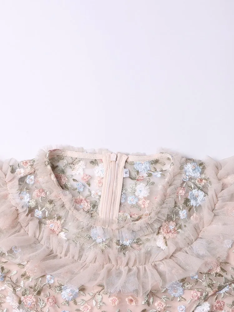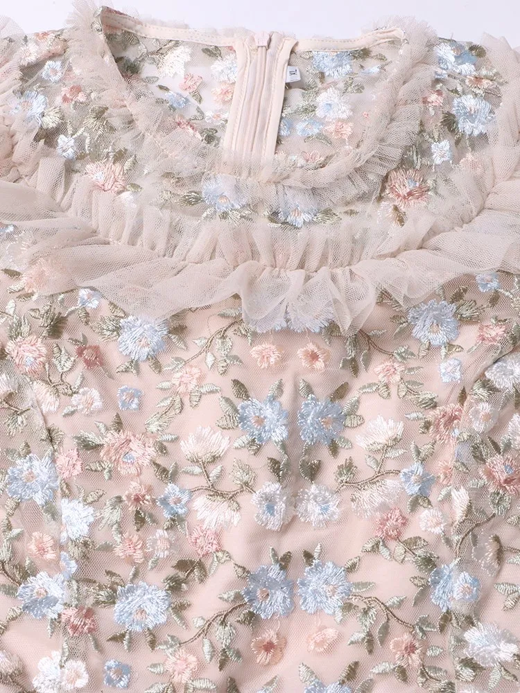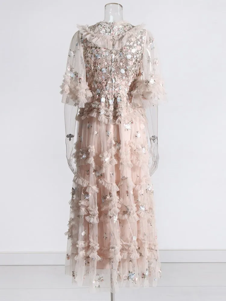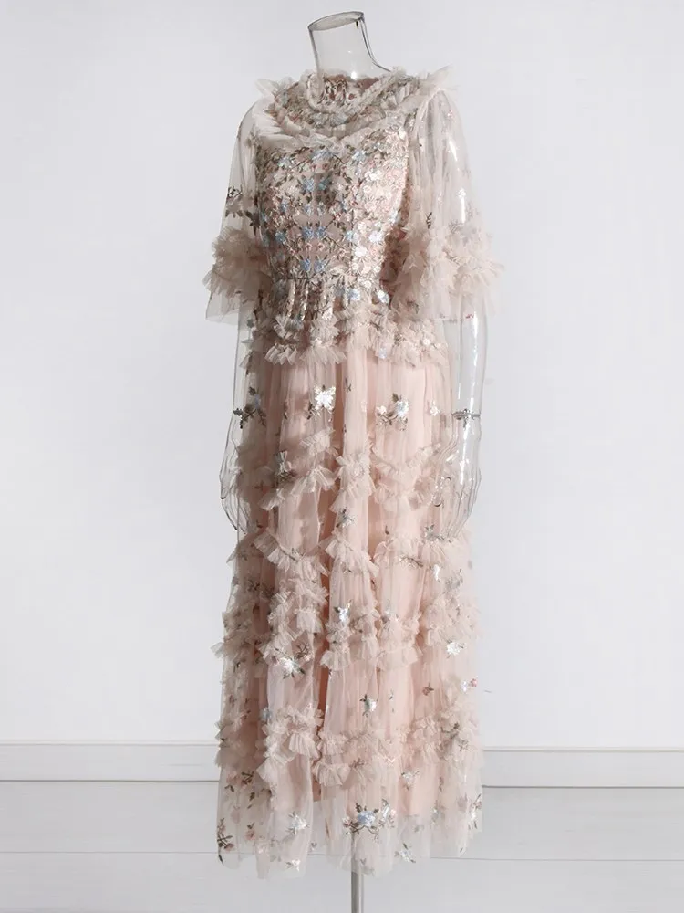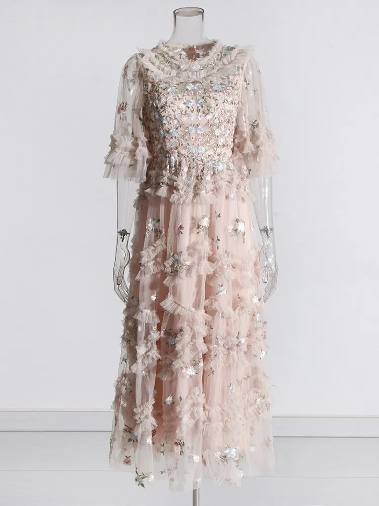 Solid Patchwork Sequins Elegant Dress For Women Round Neck Flare Sleeve High Waist Folds Vintage Long Dresses Female Style