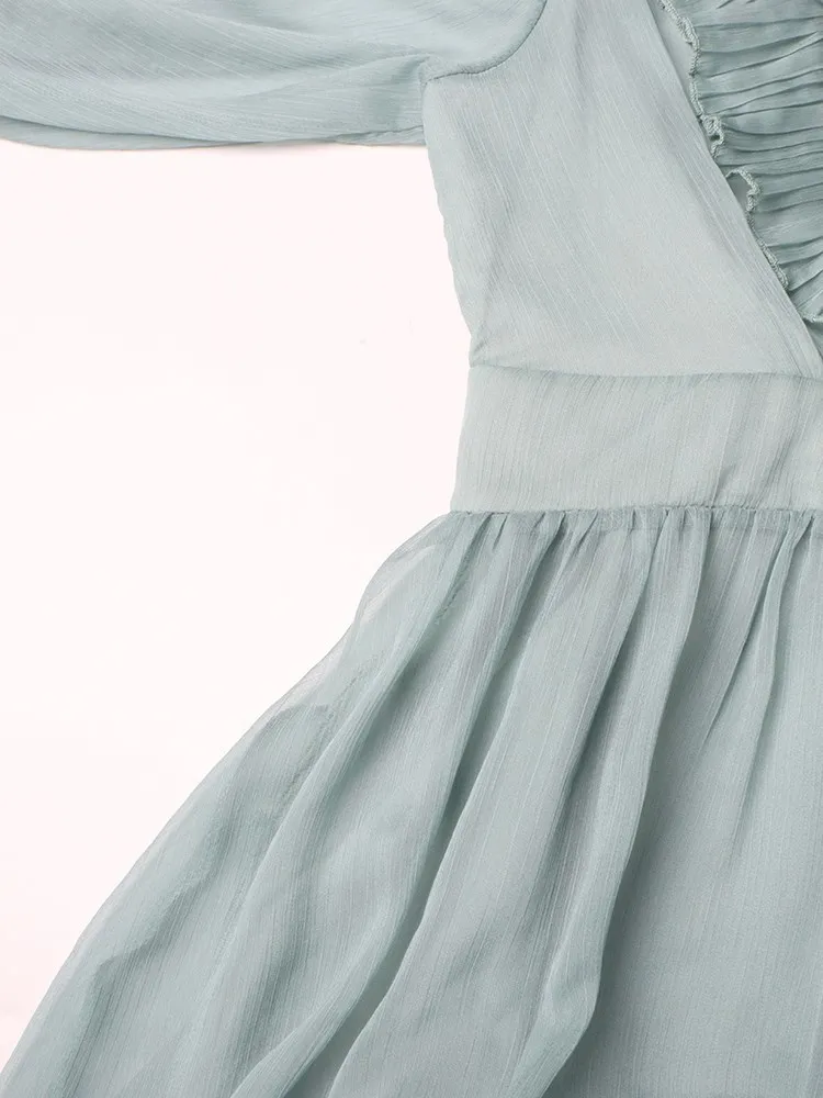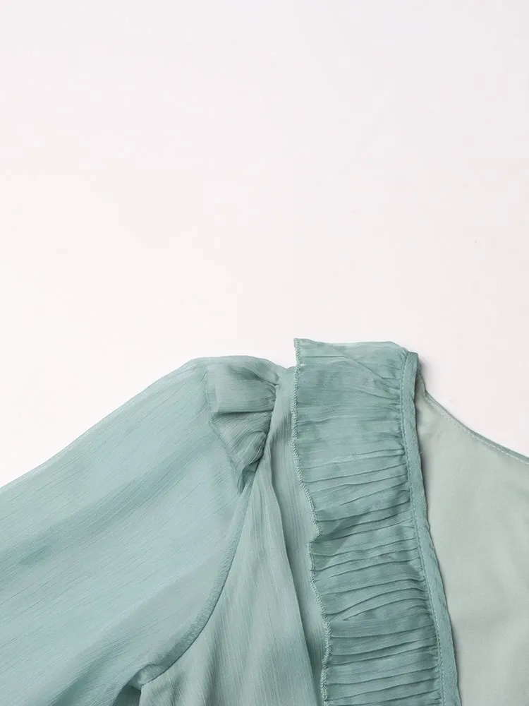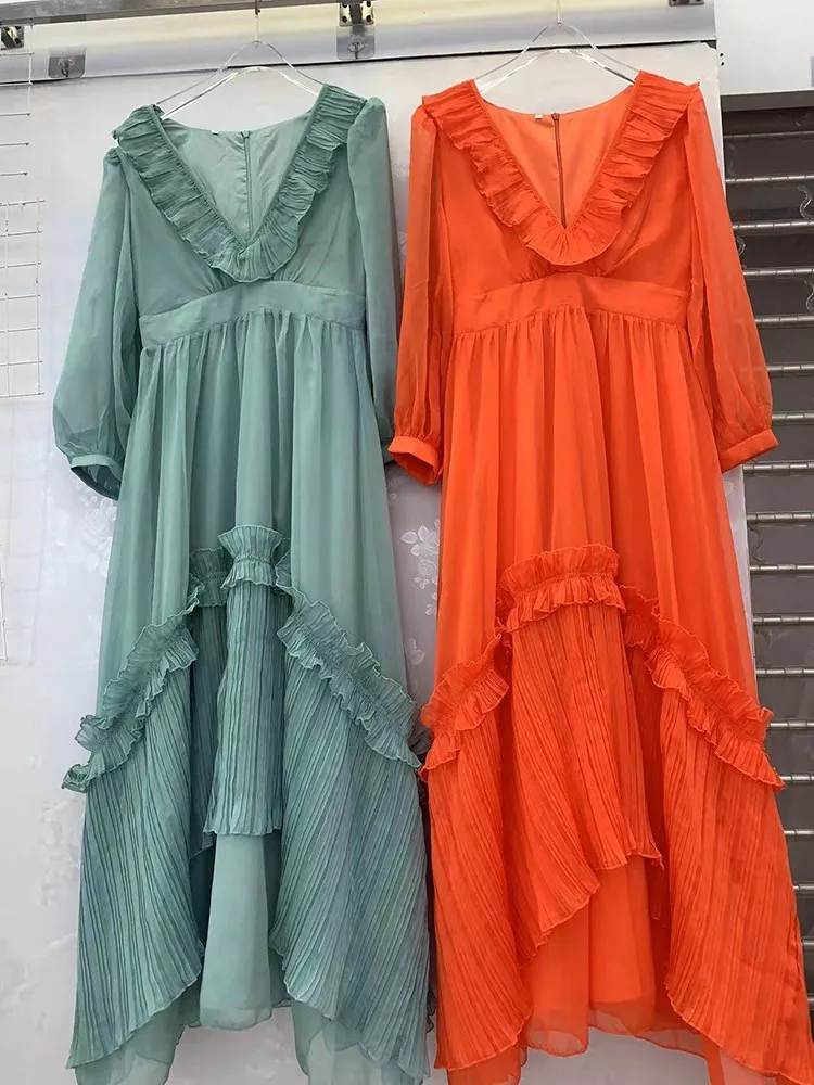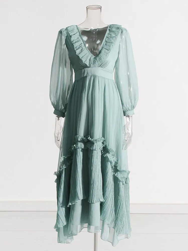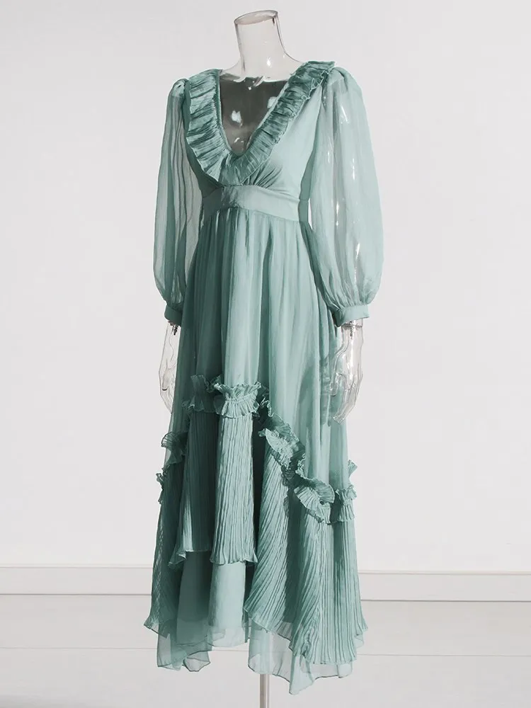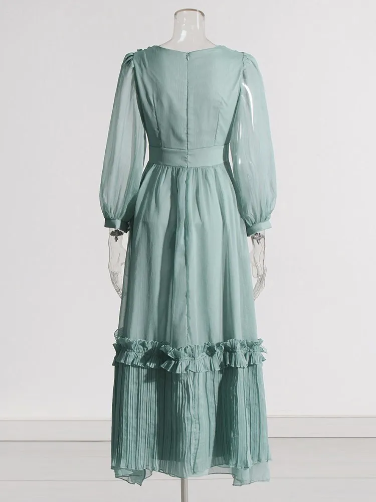 Solid Spliced Ruffles Elegant Dresses For Women V Neck Lantern Sleeve High Waist Patchwork Mesh Vintage Dress Female Style