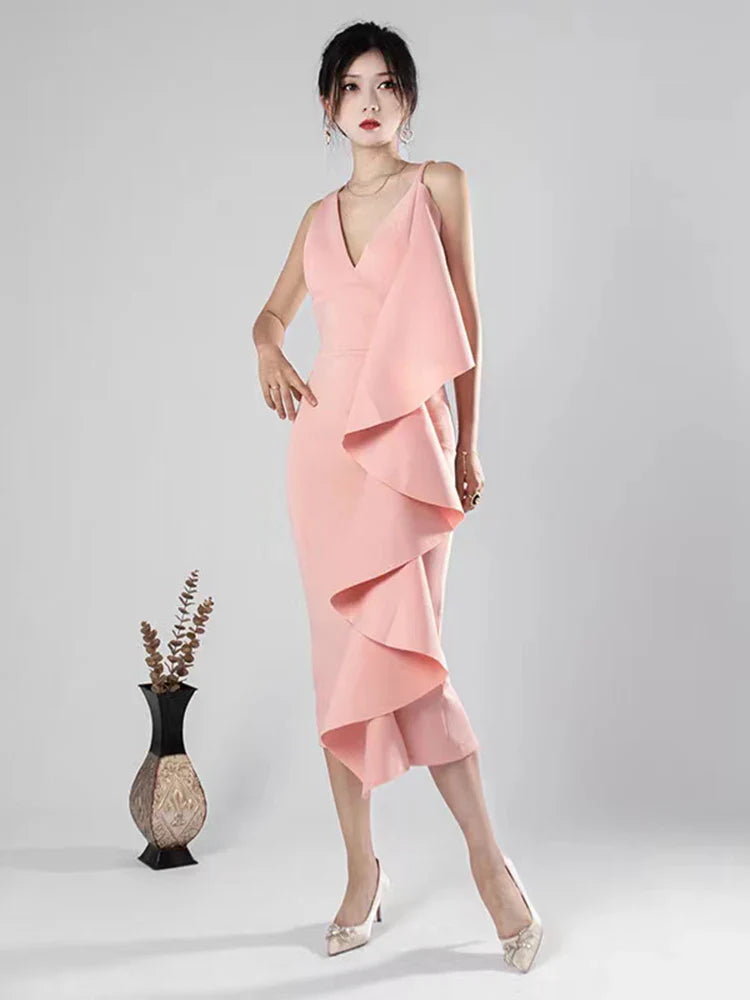 Spliced Ruffles Formal Dresses For Women V Neck Sleeveless High Waist Sexy Elegant Midi Dress Female Style Clothing New
